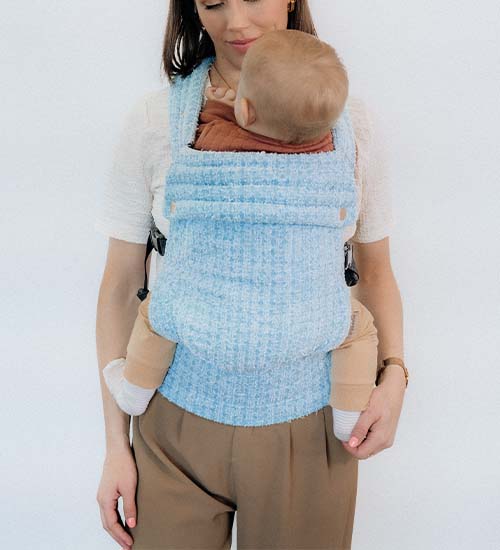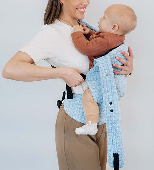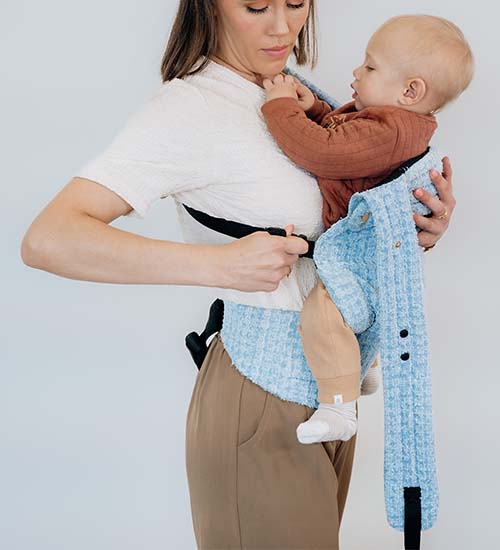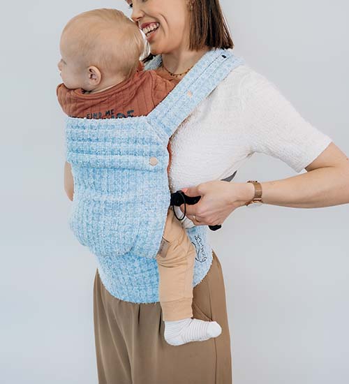 Secure the baby in the carrier, checking that their legs are positioned correctly.